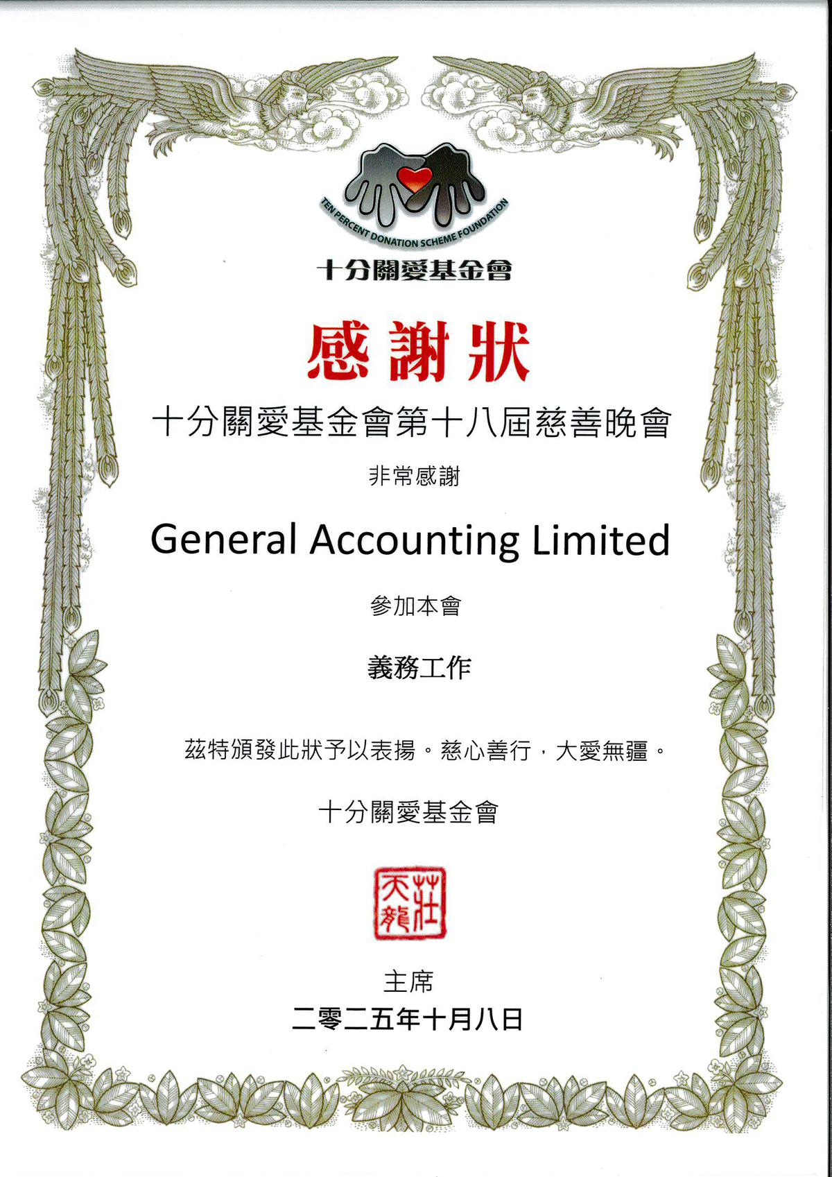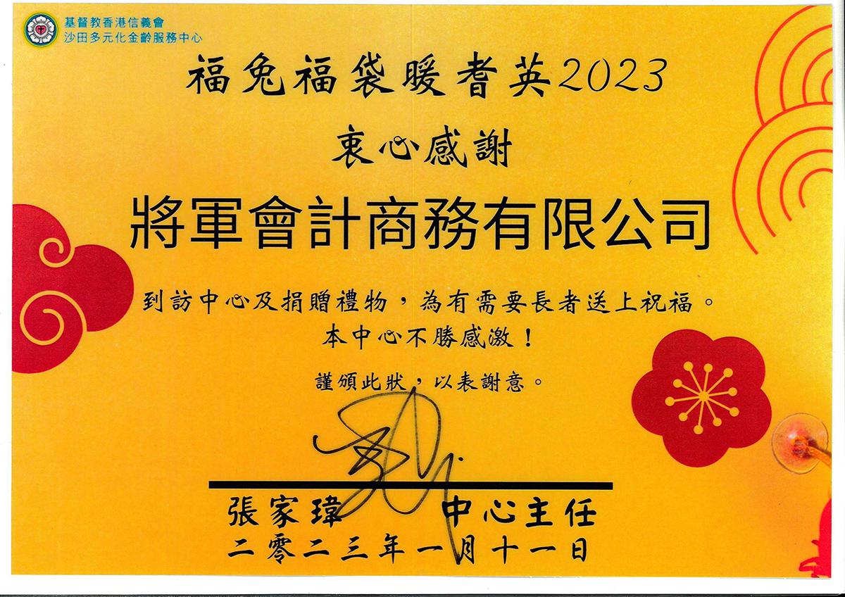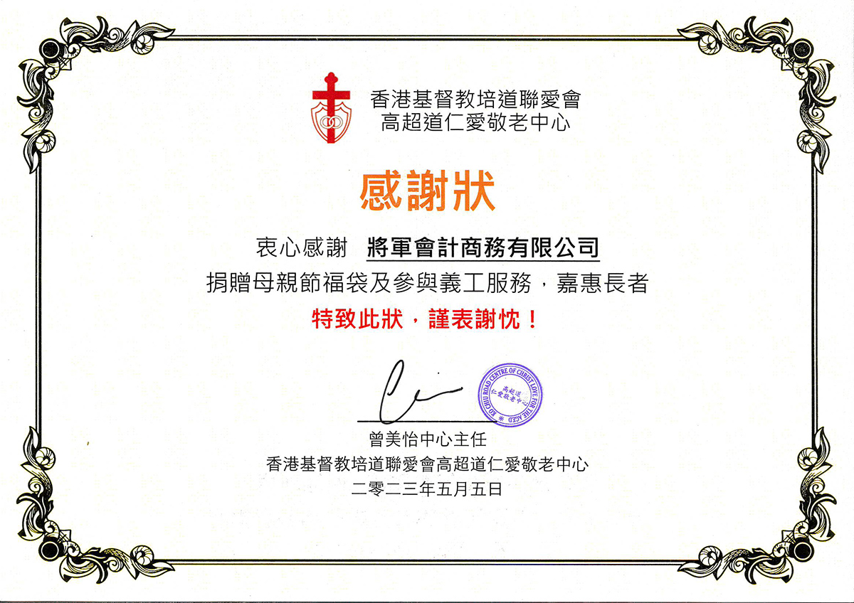 將軍會計多年來一直熱心公益,參與不同慈善活動和捐款,並於2025年成立將軍慈善基金會有限公司,與不同社福機構聯合舉辦不同類型的慈善活動。如「種植心田」,鼓勵受助者種植花果,從而淨化心靈;「銀輝共享樂計劃」,資助耆英購置小家電;「共享晚宴」,邀請受助者享用豐盛晚宴等。希望貢獻一份微薄的力量,令這社會變得更美。