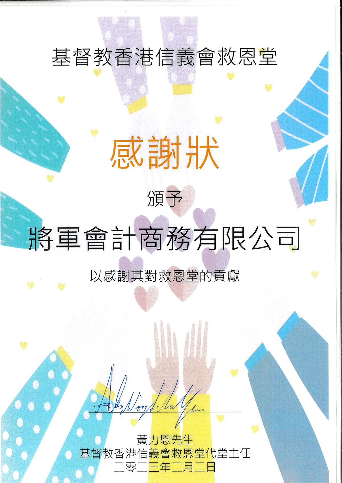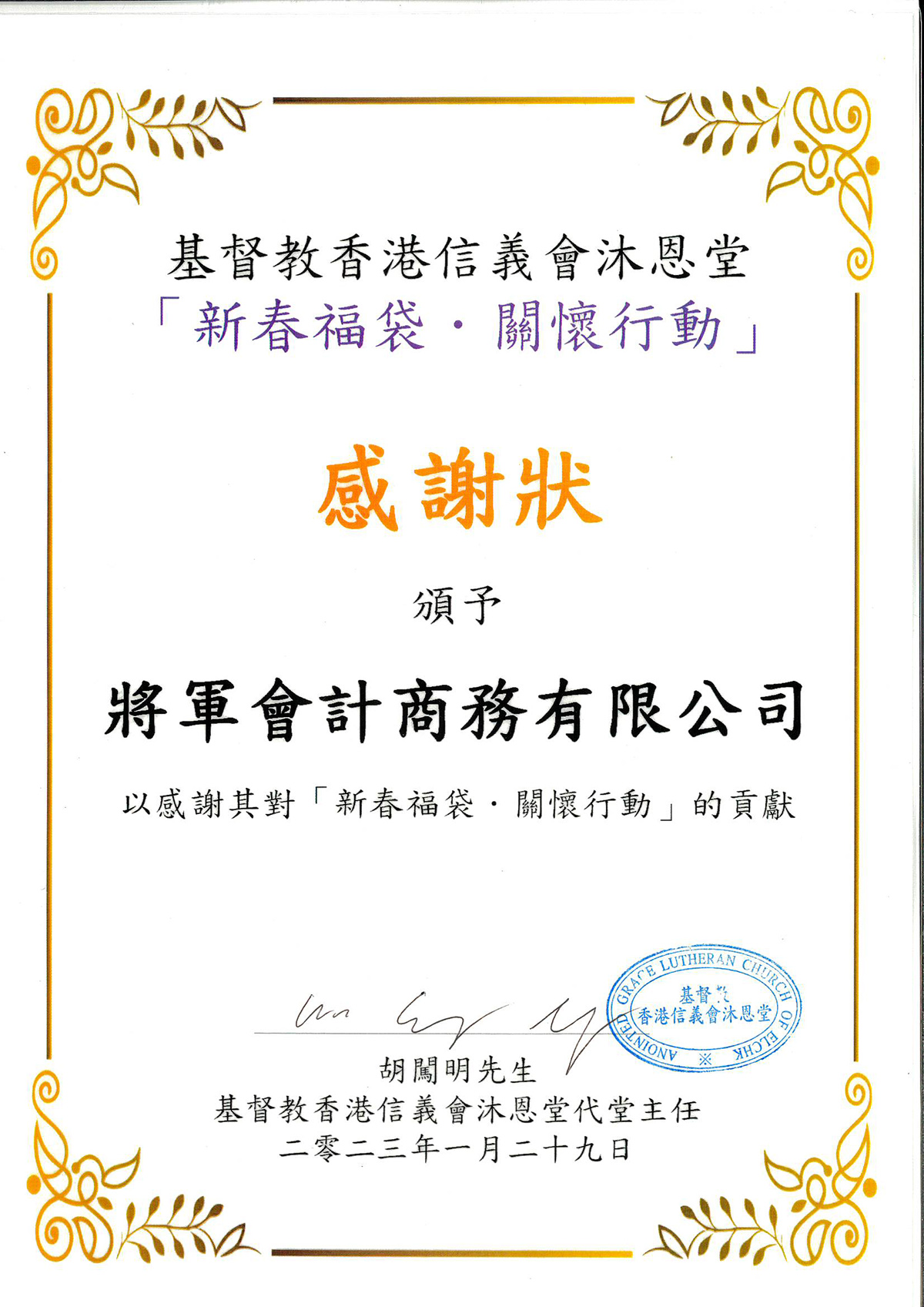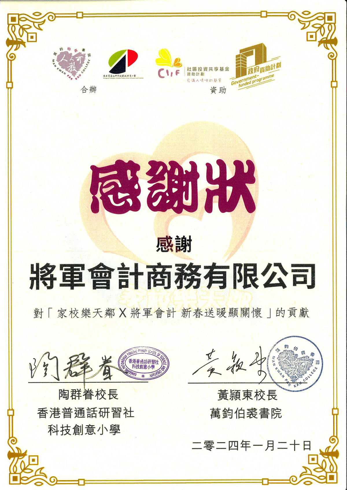 將軍會計多年來一直熱心公益,參與不同慈善活動和捐款,並於2025年成立將軍慈善基金會有限公司,與不同社福機構聯合舉辦不同類型的慈善活動。如「種植心田」,鼓勵受助者種植花果,從而淨化心靈;「銀輝共享樂計劃」,資助耆英購置小家電;「共享晚宴」,邀請受助者享用豐盛晚宴等。希望貢獻一份微薄的力量,令這社會變得更美。